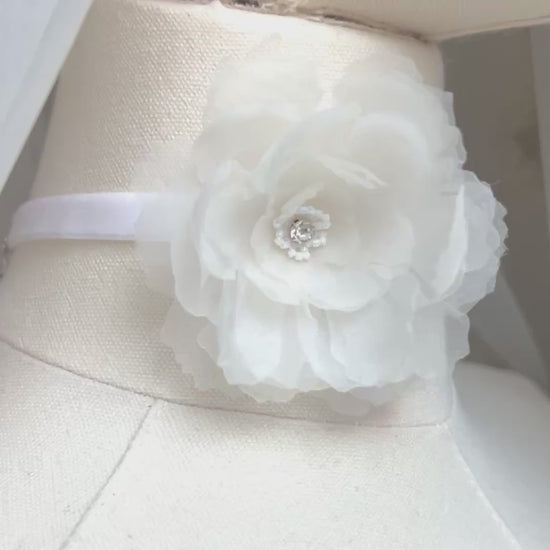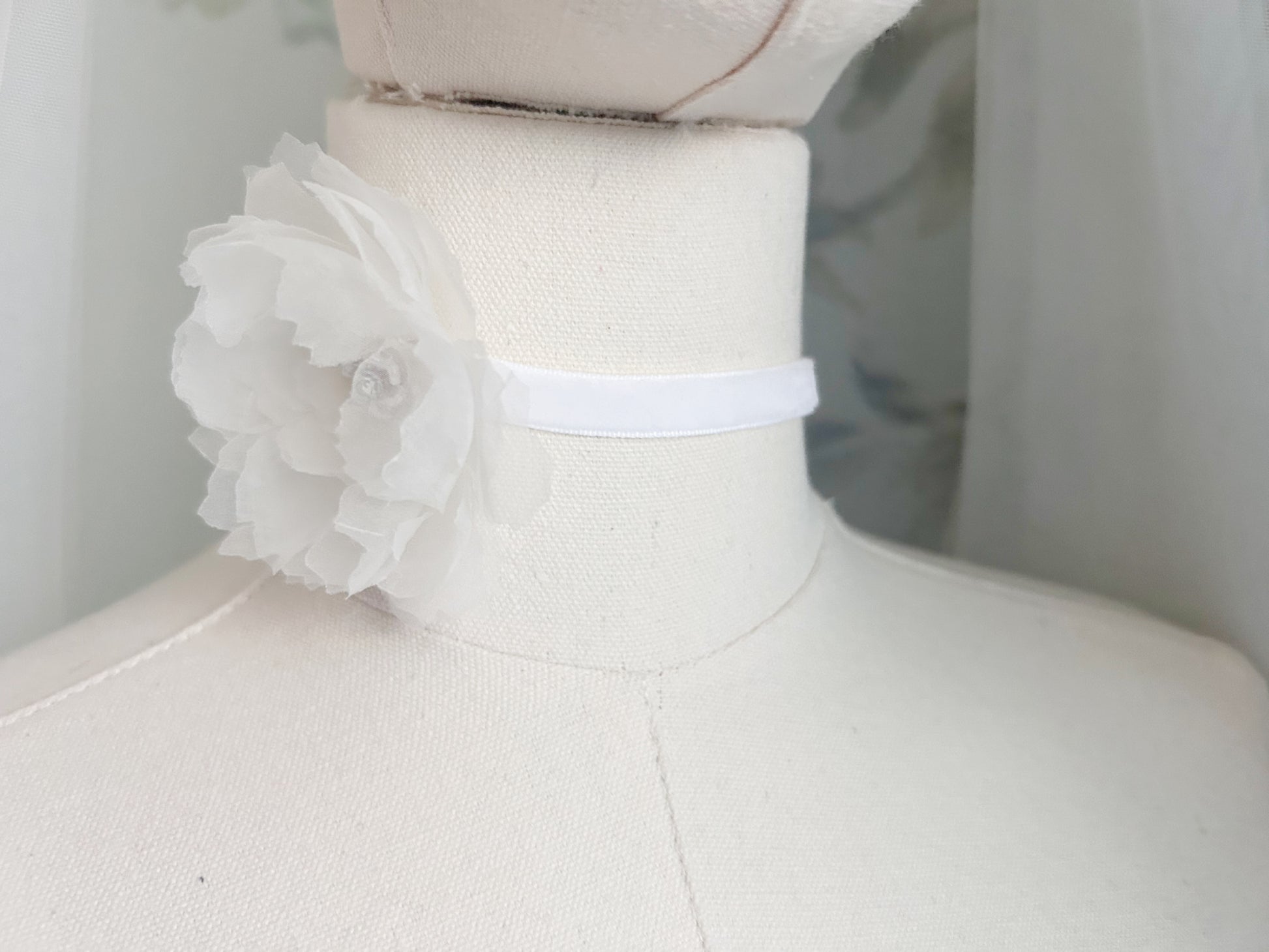 Handcrafted from natural silk in our Dallas studio, this delicate bridal choker features a soft layered flower with a delicate hand beaded center. The design blends modern minimalism with romantic detail, perfect for brides seeking an elegant finishing touch. Lightweight and comfortable, it pairs beautifully with strapless gowns, minimalist dresses, or vintage-inspired looks. Each piece is made to order, ensuring a unique accessory for your wedding day.