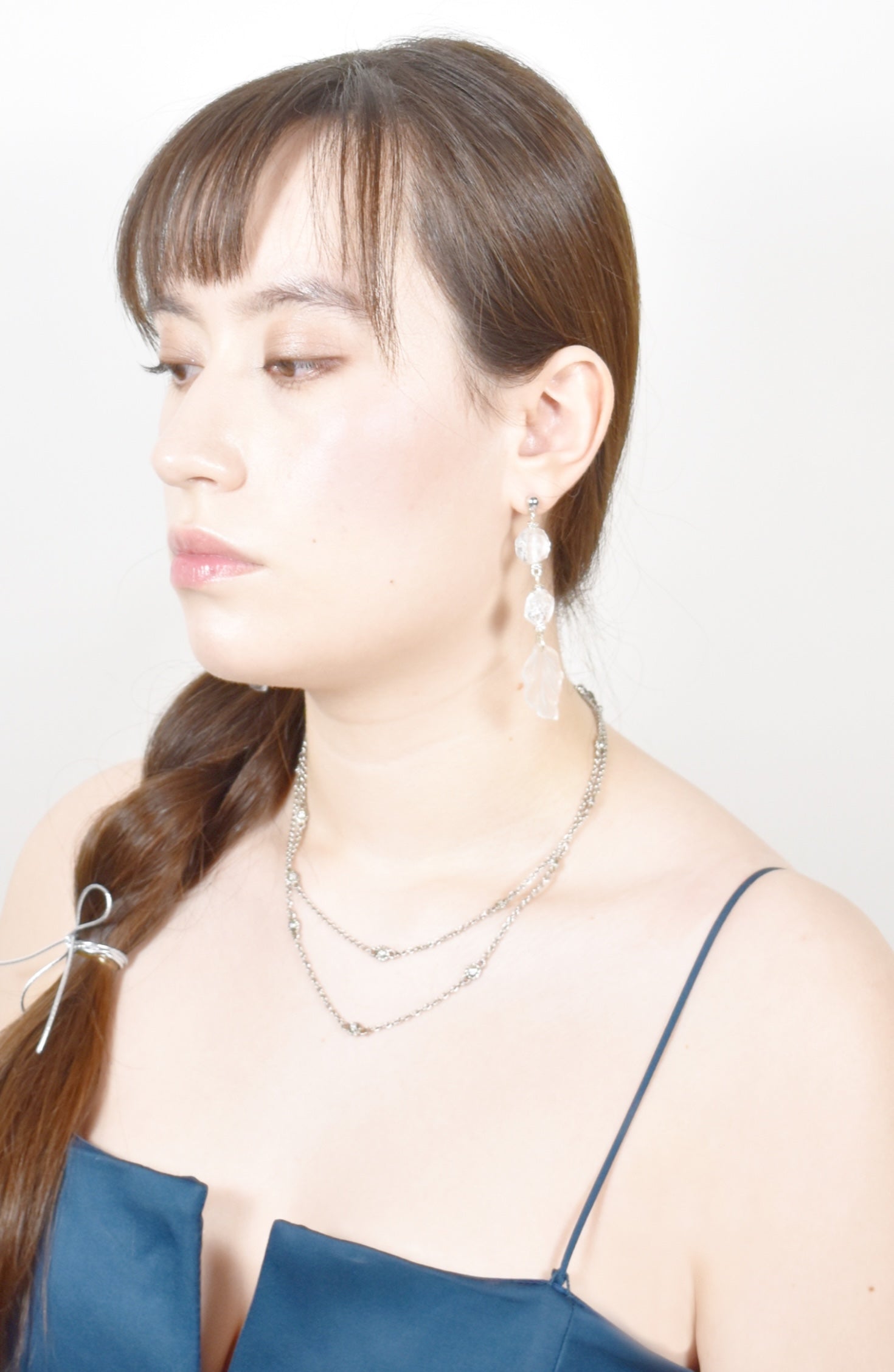 These exquisite, handcrafted earrings, thoughtfully designed in our Dallas studio, feature faceted frosted glass beads with a fractured-glass effect that catches and scatters light with a subtle, mesmerizing shimmer, paired with sparkling rhinestones and delicate European glass leaves. Each element is carefully arranged to create a luminous, sculptural effect that glows from every angle. Lightweight and effortlessly wearable, these earrings offer a perfect blend of modern shine and elegant femininity, adding a touch of refined sparkle to everything from everyday outfits to special evening occasions.