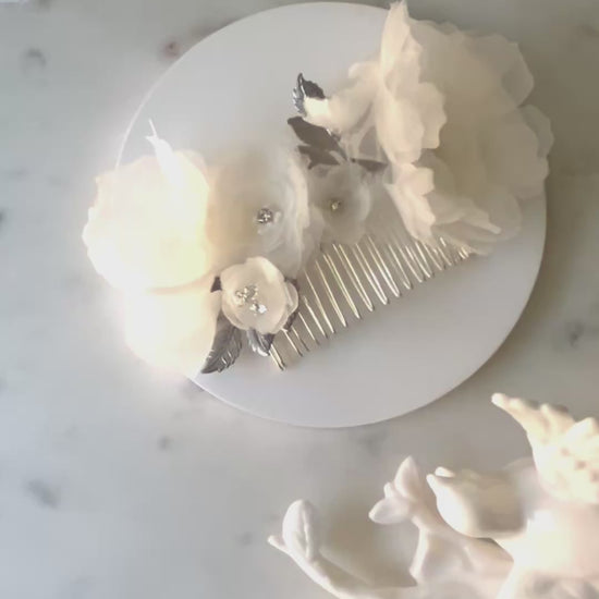 Delicate silver-toned leaves are hand cast and nestled among the flowers, giving the piece an elegant, old-world charm. The metal comb is wrapped in velvet for a smooth, snag-free fit and slides comfortably into a variety of hairstyles, from loose waves to polished updos.