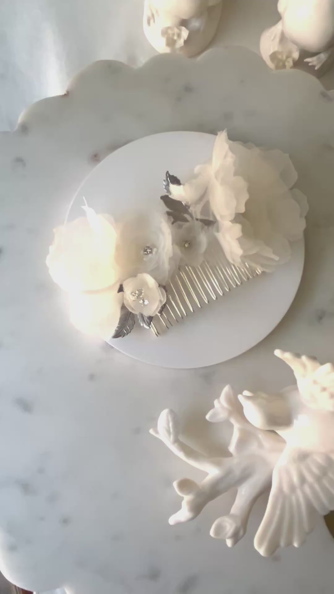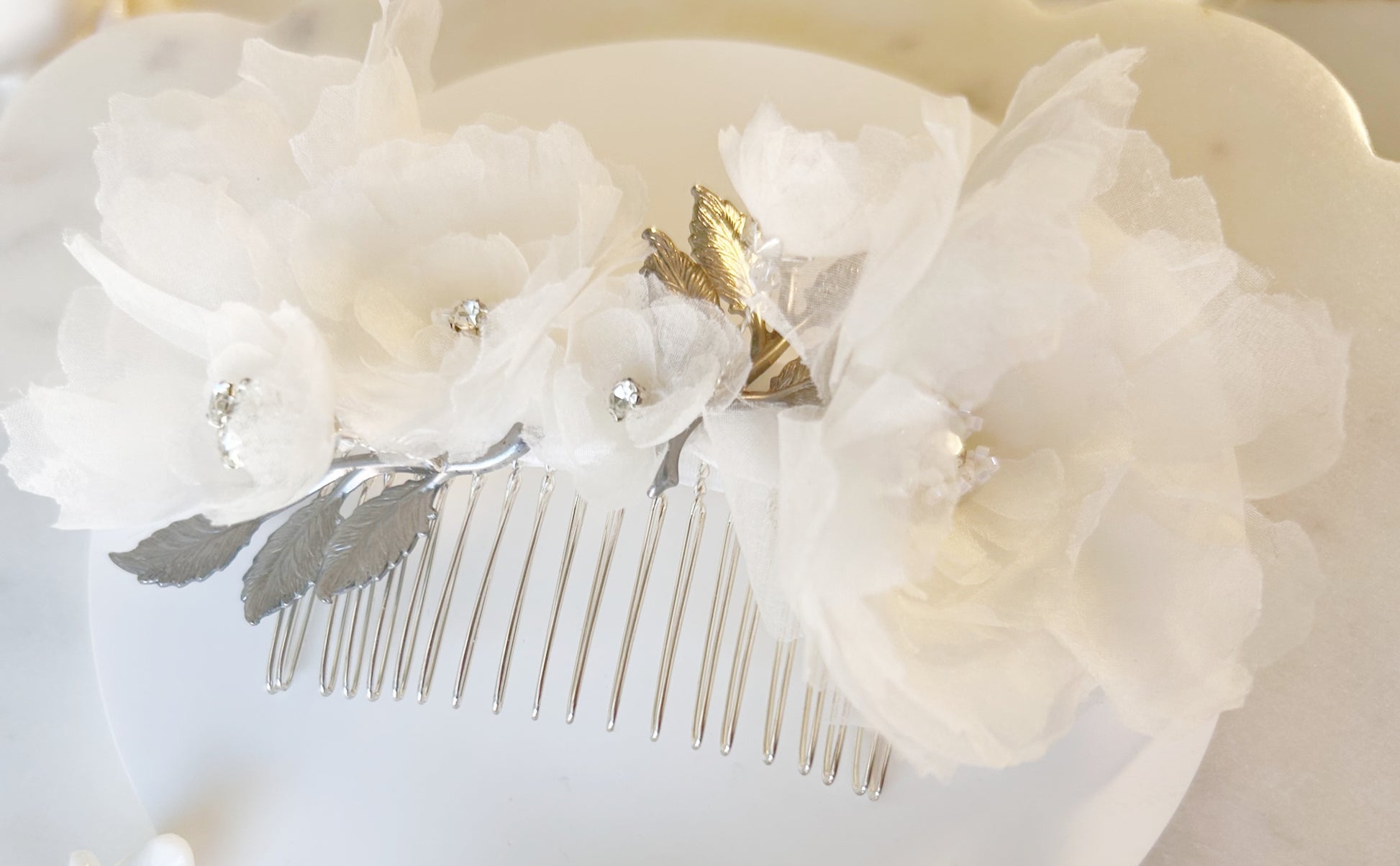 Bring effortless romance to your bridal look with this Silk Organza Petal Bloom Comb, designed with airy florals and vintage-inspired details. Each bloom is crafted from sheer natural silk petals, pressed and layered by hand to create soft, natural movement. The centers are finished with sparkly rhinestones that catch the light with every turn, and delicate Japanese beads adding a touch of refined shimmer.